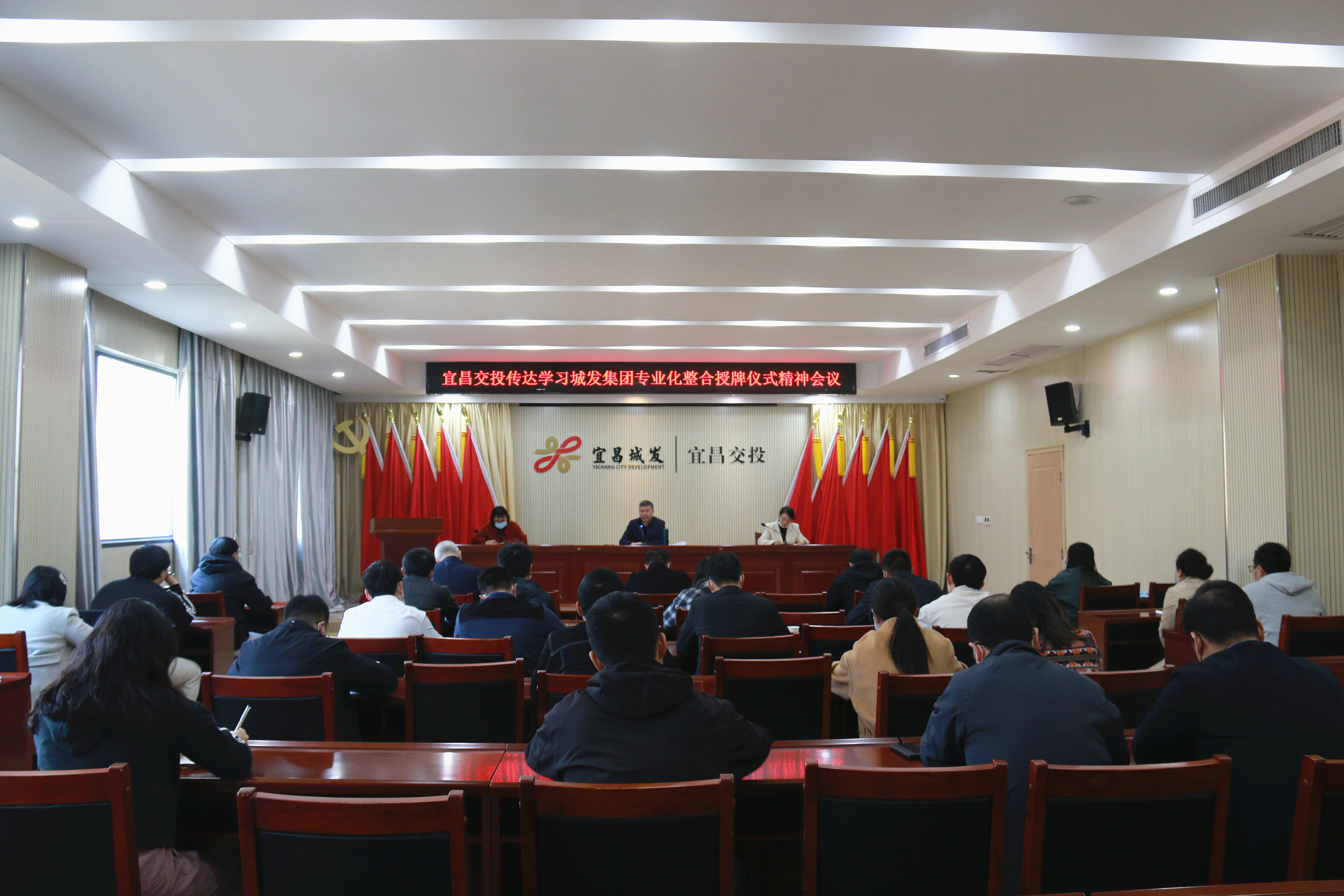 二、11月20日,宜昌城發(fā)投資集團(tuán)有限公司在交投大廈六樓會(huì)議室召開(kāi)干部任職大會(huì),傳達(dá)城發(fā)集團(tuán)專業(yè)化整合授牌儀式會(huì)議精神。城發(fā)集團(tuán)黨委委員、紀(jì)委書記劉仁,城發(fā)集團(tuán)黨委委員、副總經(jīng)理,城發(fā)投資集團(tuán)黨委書記、董事長(zhǎng)李江濤,城發(fā)集團(tuán)黨委辦公室主任歐陽(yáng)博,城發(fā)集團(tuán)組織部部長(zhǎng)饒學(xué)敬出席會(huì)議,新成立的宜昌城發(fā)投資集團(tuán)有限公司全體領(lǐng)導(dǎo)班子成員、各子公司領(lǐng)導(dǎo)班子及中層干部參加了會(huì)議。會(huì)議由李江濤主持。會(huì)上宣讀了宜昌城市發(fā)展投資集團(tuán)有限公司關(guān)于組建宜昌城發(fā)投資集團(tuán)有限公司的通知和干部任免文件。城發(fā)投資集團(tuán)班子成員依次進(jìn)行表態(tài)發(fā)言。李江濤要求,集團(tuán)所屬各子公司要提高認(rèn)識(shí),堅(jiān)定信心,把思想統(tǒng)一到改革發(fā)展的大局上來(lái);要嚴(yán)肅紀(jì)律,端正作風(fēng),確保改革重組工作風(fēng)清氣正;要加強(qiáng)學(xué)習(xí),練就本領(lǐng),堅(jiān)決扛起城市建設(shè)主力軍的重任。城發(fā)集團(tuán)黨委委員、紀(jì)委書記劉仁強(qiáng)調(diào),城發(fā)投資集團(tuán)在城發(fā)集團(tuán)“255產(chǎn)業(yè)矩陣”中具有重要戰(zhàn)略意義,城發(fā)投資集團(tuán)要提高站位,自我加壓,對(duì)標(biāo)看齊,迅速完成公司班子成員分工、架構(gòu)整合、股權(quán)劃轉(zhuǎn)等各項(xiàng)規(guī)范化工作,不折不扣落實(shí)集團(tuán)既定的工作安排。要高點(diǎn)定位,統(tǒng)籌發(fā)展,做好2023年的謀篇布局工作,全力以赴推動(dòng)明年重點(diǎn)項(xiàng)目建設(shè)工作強(qiáng)勢(shì)開(kāi)局,堅(jiān)決扛起責(zé)任擔(dān)當(dāng),為城發(fā)集團(tuán)的高質(zhì)量發(fā)展貢獻(xiàn)堅(jiān)實(shí)力量。交投公司組織領(lǐng)導(dǎo)班子成員及中層干部參加大會(huì),并層層傳達(dá)會(huì)議精神,抓好貫徹落實(shí)。